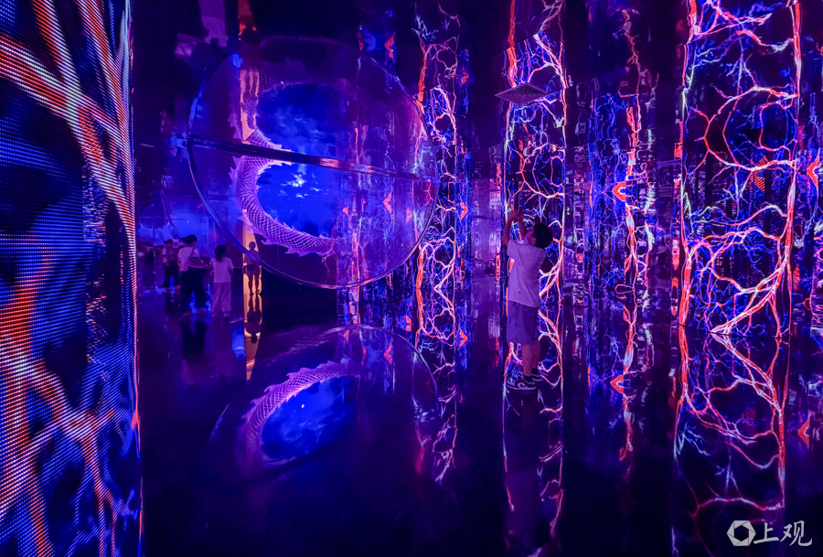 本次展览聚焦《山海经》中“身长千里、掌自然、控昼夜”的创世神祇烛龙,集全息影像、裸眼3D、实景艺术装置等表现形式于一体,并以沉浸式互动和赛博朋克美学重新定义神话叙事。