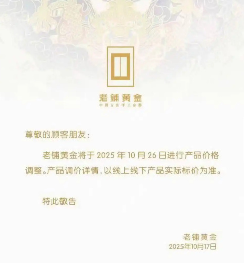 10月17日中金汇融,老铺黄金发布调价预告称将于10月26日进行产品提价调整,产品调价详情,以线上线下门店产品实际标价为准。据了解,这已经是老铺黄金年内第三次调价。