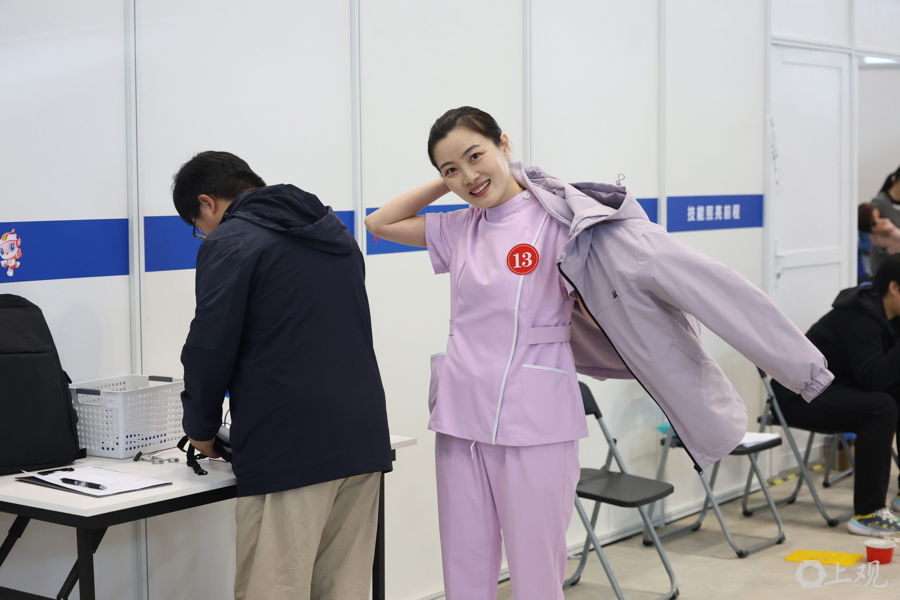 比赛中选手身份加密,抽签随机出场,围观群众不知道这位表现亮眼的选手来自何方。比赛结束后,裁判长才揭秘这是来自江苏盐城技师学院的选手朱妮妮。她还说:“你们上海育婴项目也很优秀,选手已经比完了。”